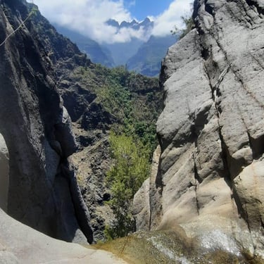 Parcours vertical engagé, rappels successifs dans un décor volcanique grandiose, et final mythique avec un rappel de 90 mètres en fil d’araignée pour déboucher au cœur de "La Chapelle", site naturel spectaculaire et unique à La Réunion.