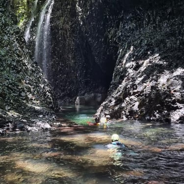 Longues sections de nage, passages en floating, glissades naturelles et moments de pure contemplation : vous évoluez au cœur d’un canyon à l’eau cristalline, sous une canopée lumineuse où les rayons du soleil filtrent à travers la végétation tropicale.